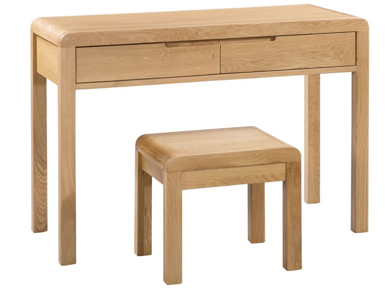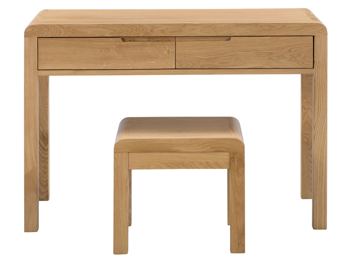 Crafted from solid white oak and oak veneers, the Curve combines clean lines with a gentle curved edging, adding a stunning touch to any bedroom. Recessed handles enable easy opening and a modern feel. This Curve dressing table features 2 drawers, perfect for extra storage for your morning routine. Accompanied by the curve stool. Part of the extensive Curve bedroom range from Julian Bowen
