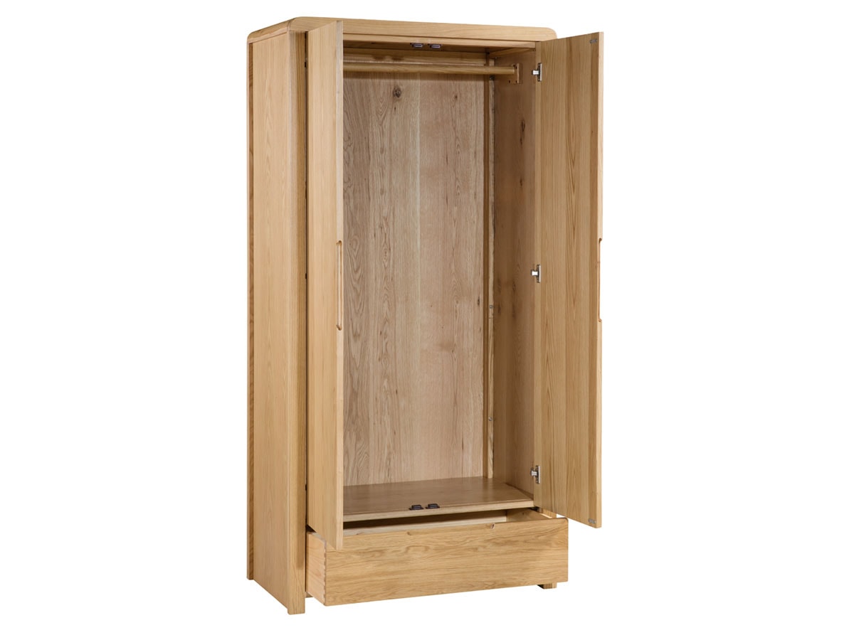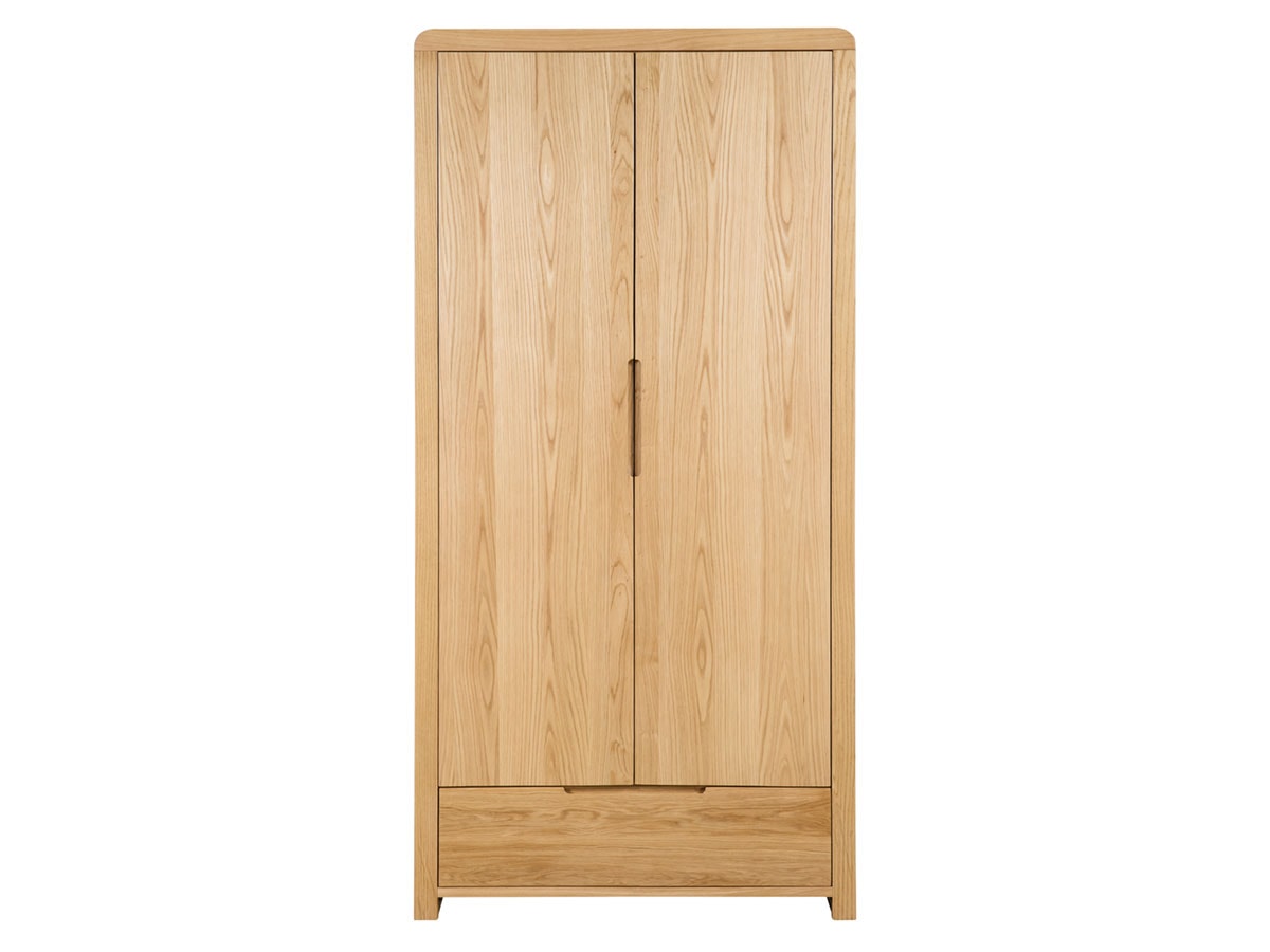 Crafted from solid white oak and oak veneers, the Curve combines clean lines with a gentle curved edging, adding a stunning touch to any bedroom. Recessed handles enable easy opening and a modern feel. This Curve wardrobe has an ample hanging space featuring 2 doors and 1 drawer, perfect for extra storage. Part of the extensive Curve bedroom range from Julian Bowen