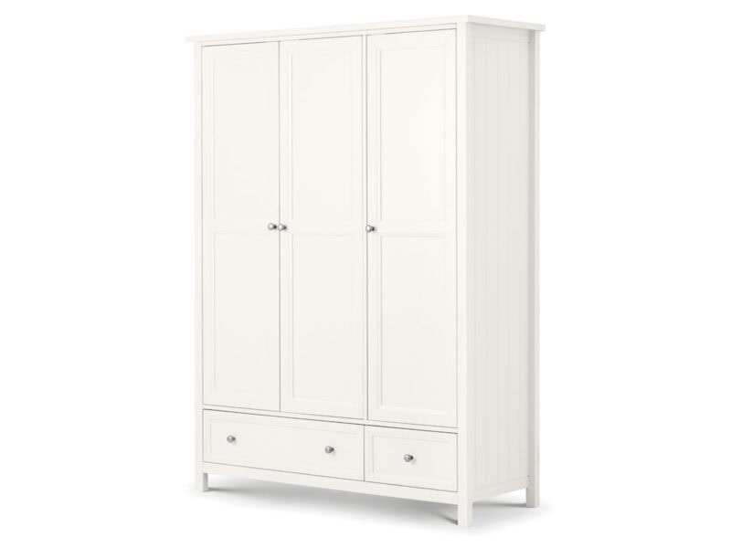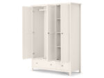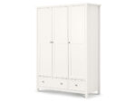 An elegant New England style wardrobe with three doors and two drawers. The combination of exquisite surf white lacquered finish with characteristic side panelling and detailed chamfered cabinetry makes for a soothing and refined aesthetic with timeless appeal, while delicate pewter handles add the perfect finishing touch.