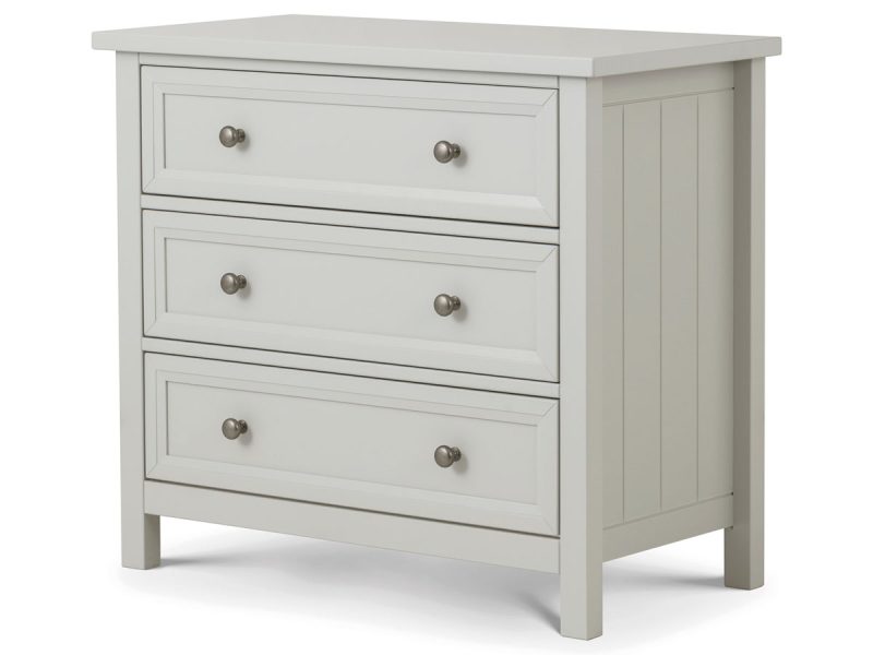Maine is an elegant New England style range of bedroom furniture. The combination of exquisite dove grey lacquered finish with characteristic side panelling and detailed chamfered cabinetry makes for a soothing and refined aesthetic with timeless appeal, while delicate pewter handles add the perfect finishing touch. The Maine 3 drawer chest offers three large storage drawers.