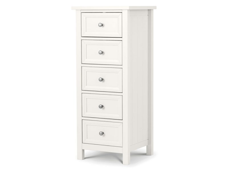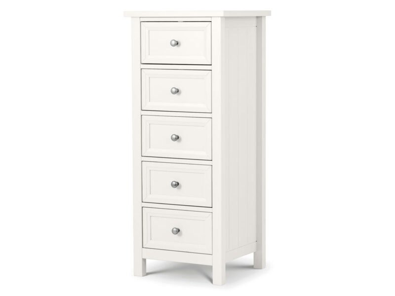 Maine is an elegant New England style range of bedroom furniture. The combination of exquisite surf white lacquered finish with characteristic side panelling and detailed chamfered cabinetry makes for a soothing and refined aesthetic with timeless appeal, while delicate pewter handles add the perfect finishing touch.The maine 5 drawer tall chest’s compact footprint makes it a great storage solution for smaller bedrooms