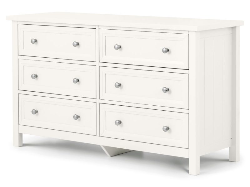Maine is an elegant New England style range of bedroom furniture. The combination of exquisite surf white lacquered finish with characteristic side panelling and detailed chamfered cabinetry makes for a soothing and refined aesthetic with timeless appeal, while delicate pewter handles add the perfect finishing touch. The Maine 6 drawer wide chest offers copious amounts of storage and can also be used as a dressing table