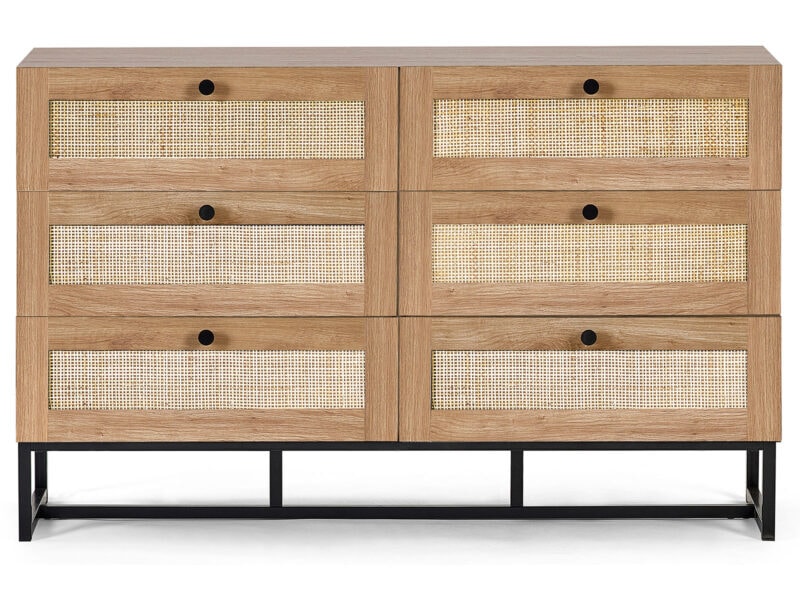 Fusing modern construction with retro design elements, the Padstow collection will exquisitely complement any styled home. The natural rattan fronts and industrial-style base collaborate perfectly to leave a warm yet chic aesthetic in your home. This range includes a bedside, 3 drawer chest, 6 drawer chest, wardrobe, coffee table, TV unit, sideboard, and tall bookcase. Also available in a black finish.