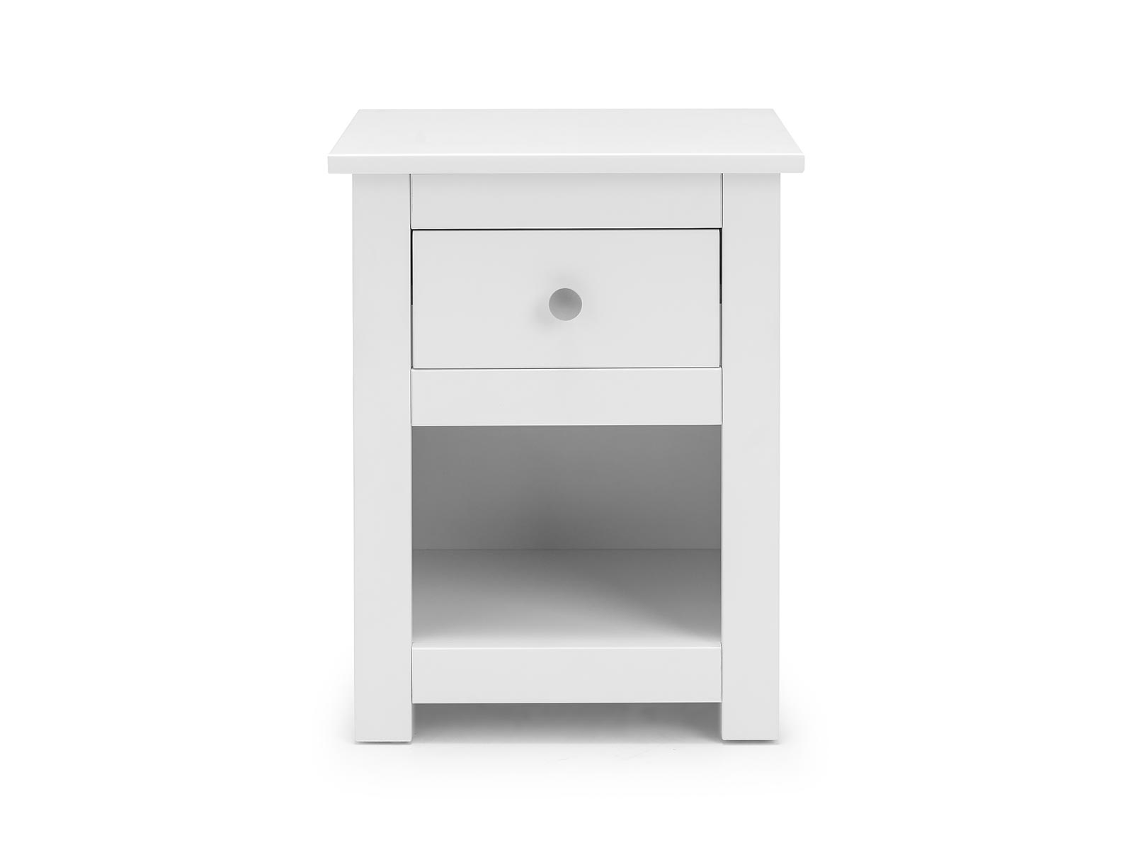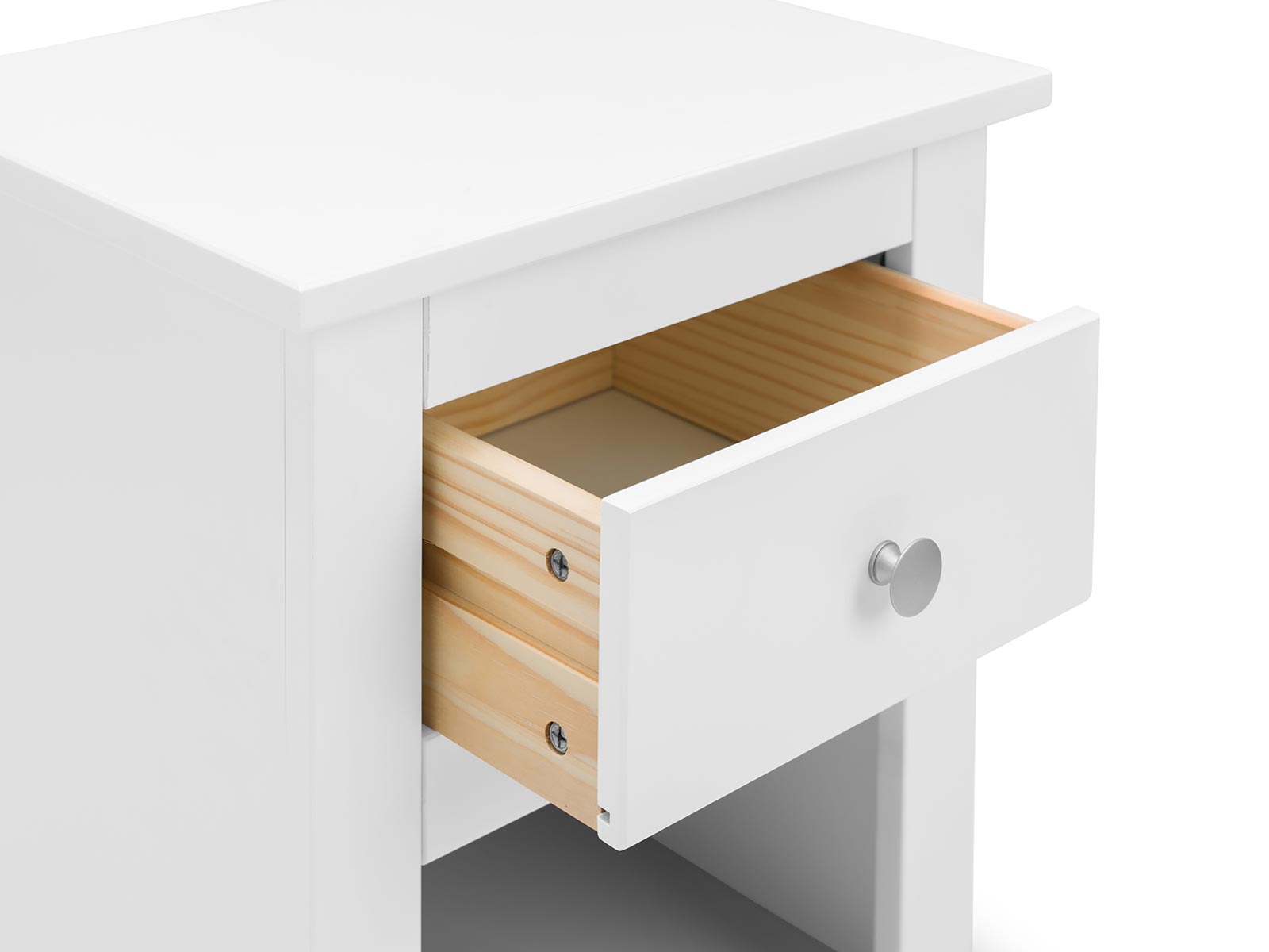 Boasting clean, simple lines the Radley one drawer bedside is perfectly suited for both modern or traditional styles. Featuring one drawer and a shelf to store away essential items at reach from your bedside. Finished in a surf white lacquer, with delicate silver handles, the Radley Bedroom Collection is perfect for adult and kids bedrooms.