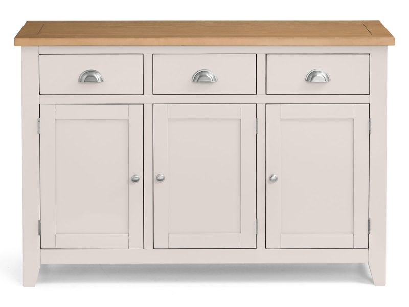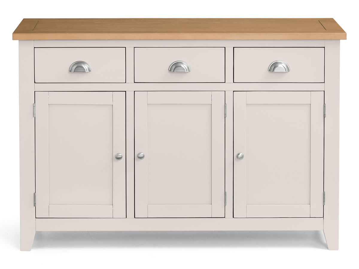 An elegant Sideboard, presented in an immaculate painted, soft Elephant Grey finish with beautiful pale oak top, crafted from a combination of high grade White Oak solids and veneers. This stylish piece looks beautiful and offers phenomenal storage for kitchen, living or dining room. Includes three practical drawers above a double and single cupboard space, accented with chic cupped handles in a brushed steel finish; ideal for cutlery , crockery and glassware. The combination of superior quality materials and classic design ensures a timeless appeal and fits perfectly alongside both traditional and contemporary décor. Part of the extensive Richmond Dining and Occasional furniture range from Julian Bowen.