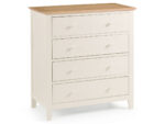 The Salerno Two-tone Ivory and Oak Four Drawer Chest is presented in the elegant Shaker style. Its clean, simple design and compact sizing offers timeless appeal and will fit well into any bedroom space. Finished in a beautiful painted ivory with high grade White Oak veneer top, Salerno combines quality materials with robust construction into a classic design. Part of the extensive Salerno range of Beds and Bedroom Furniture in Solid Oak, Two-tone Ivory/Oak and Ivory finishes.