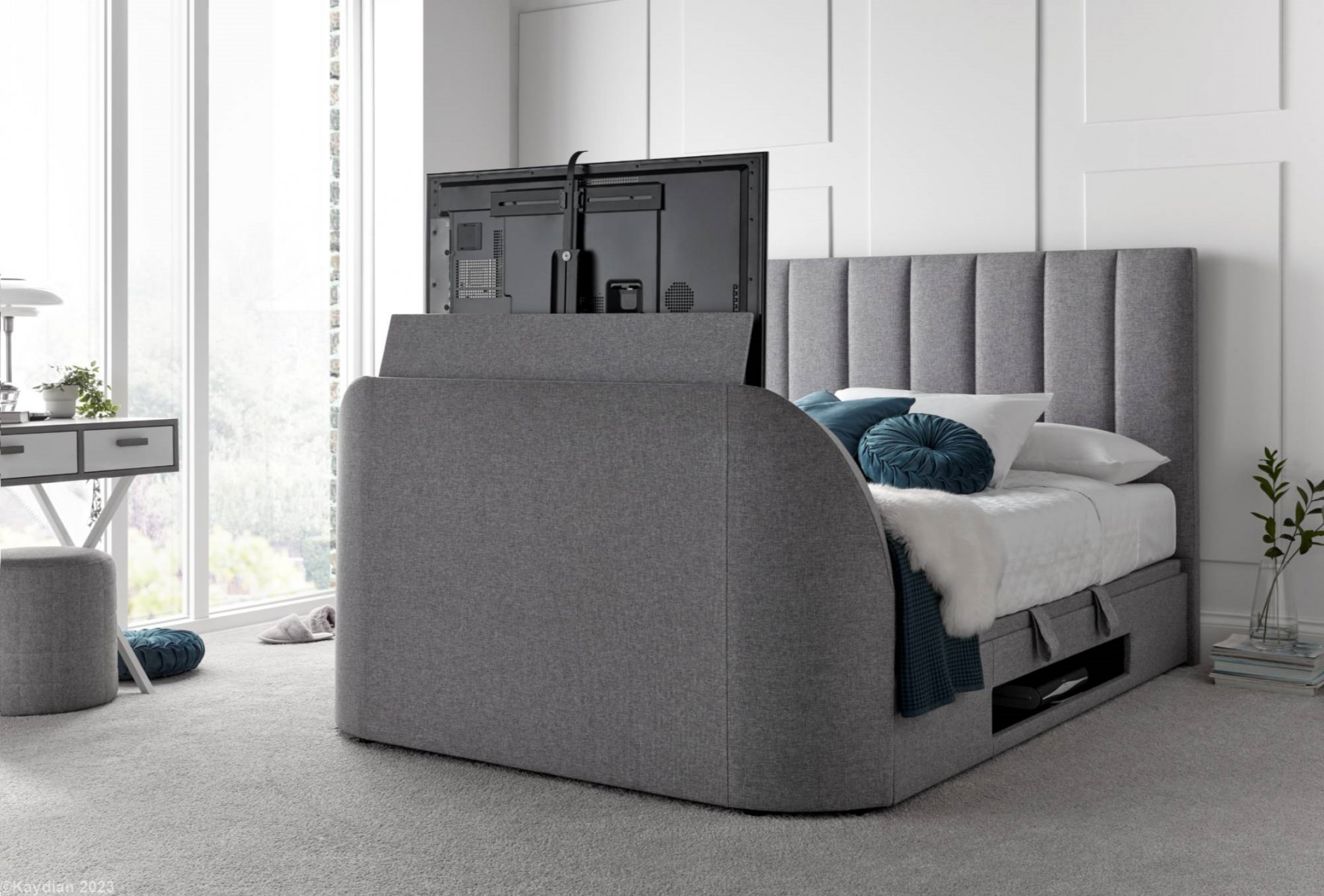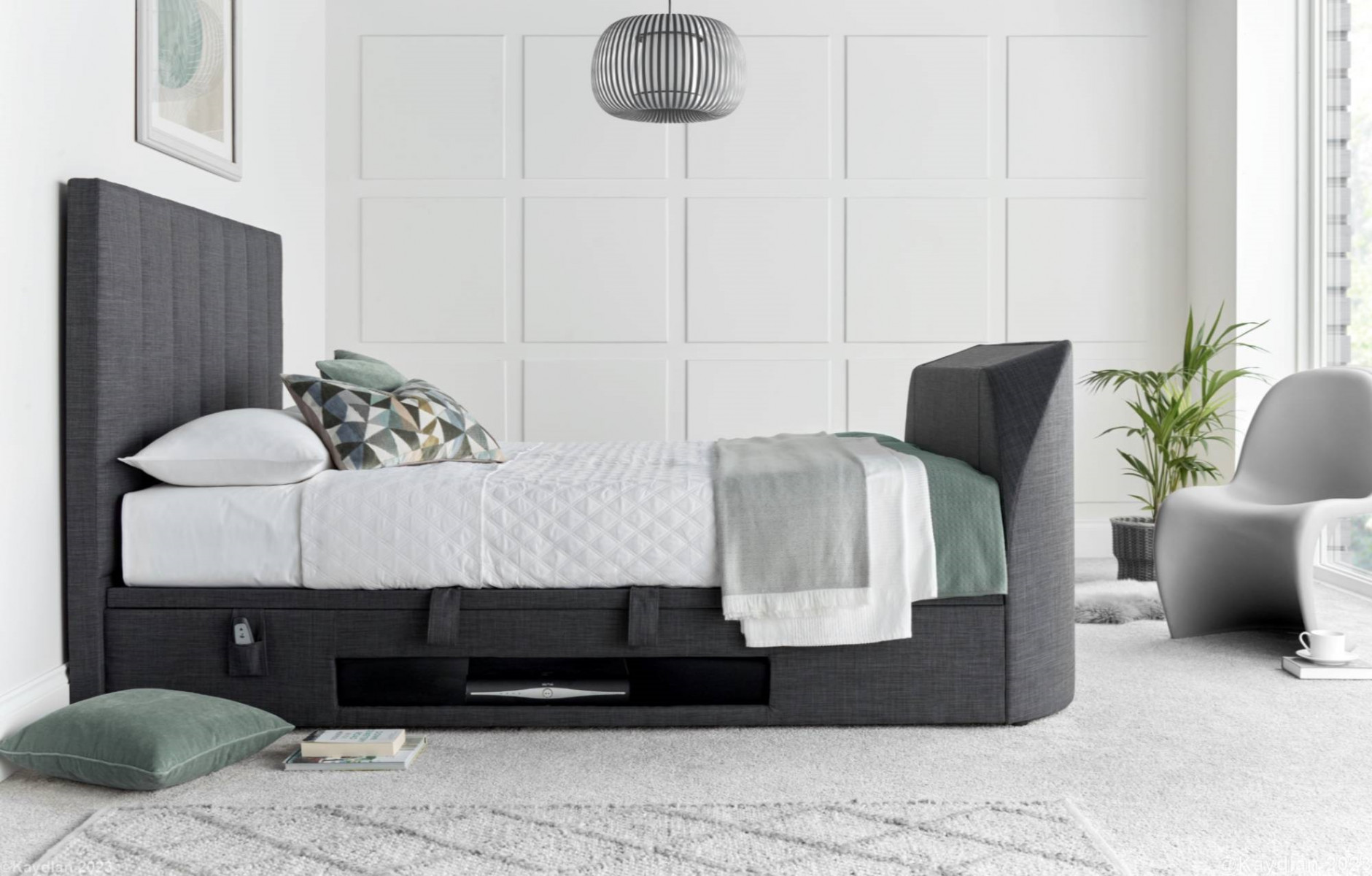 Upholstered in a soft shade of grey or slate fabric the Medburn model is a versatile storage bed.