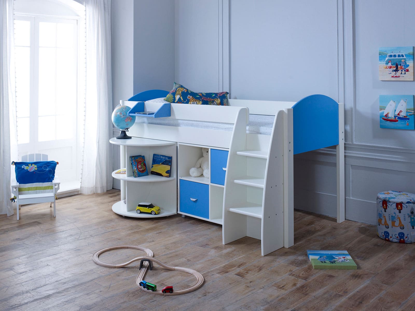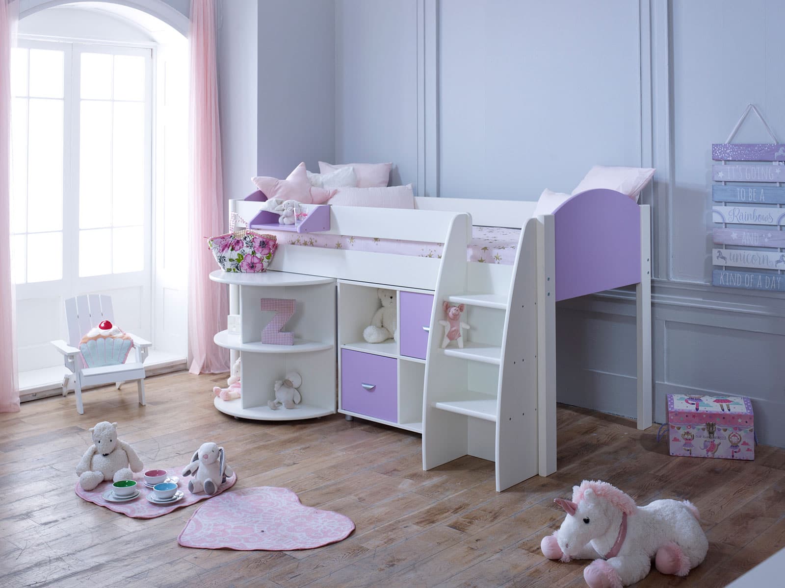 Available in 3 finishes, all white, white with lilac gable ends and cube unit doors or white with blue gable ends and cube unit doors this gorgeous combination offers storage as well as somewhere to sleep, study and play.