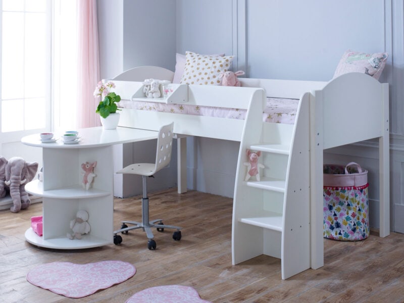 This Eli C midsleeper bed features a white freestanding cube unit with 2 door as well as a pull out desk beneath the mid height sleeping platform.
