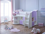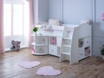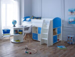 Complete with two 4 hole cube units and pull out desk The Kids Avenue Eli G midsleeper bed is a wonderful place to sleep and play.