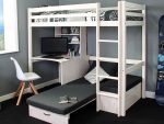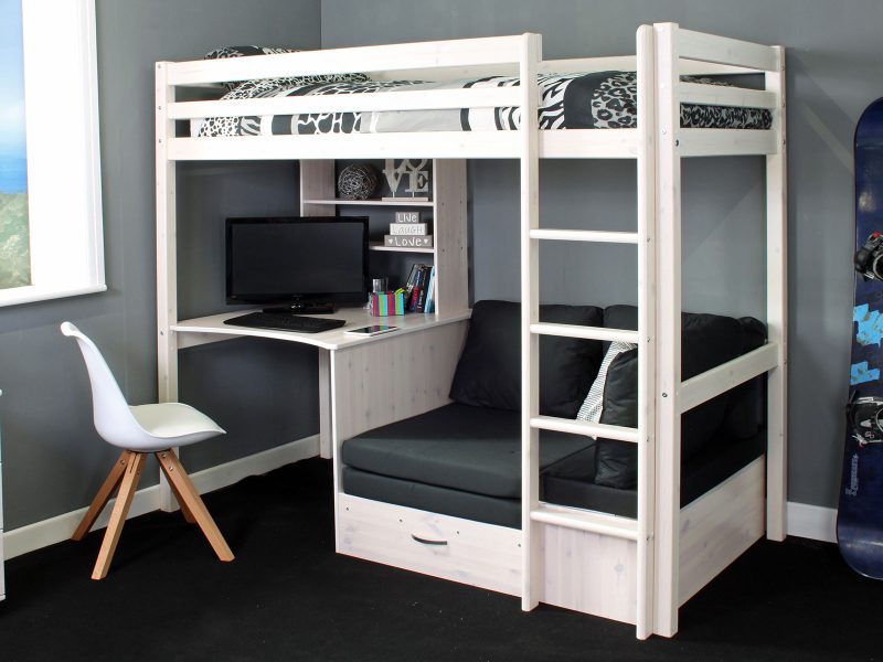 Beneath the raised sleeping platform there is a desk, a chair bed with black foam set and storage compartment. A great place for yThe Kids Avenue child to study, relax and play.