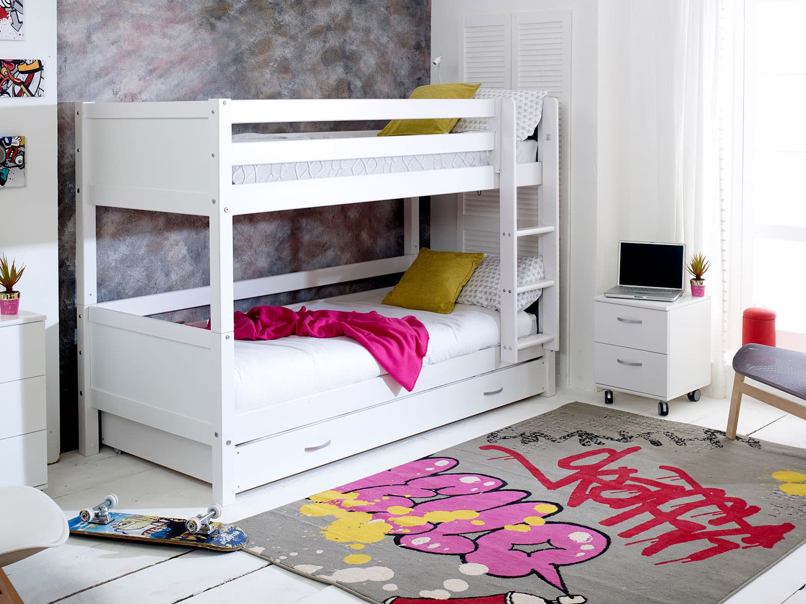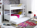 This contemporary and stylish Nordic bunkbed 3 has a sturdy white frame, straight ladder and comes complete with a trundle bed.