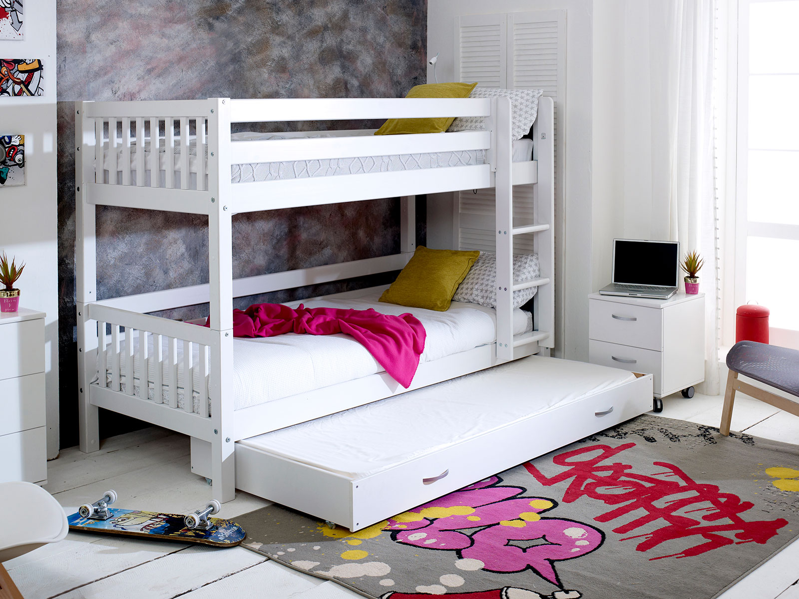 This contemporary and stylish Nordic bunkbed 3 has a sturdy white frame, straight ladder and comes complete with a trundle bed.