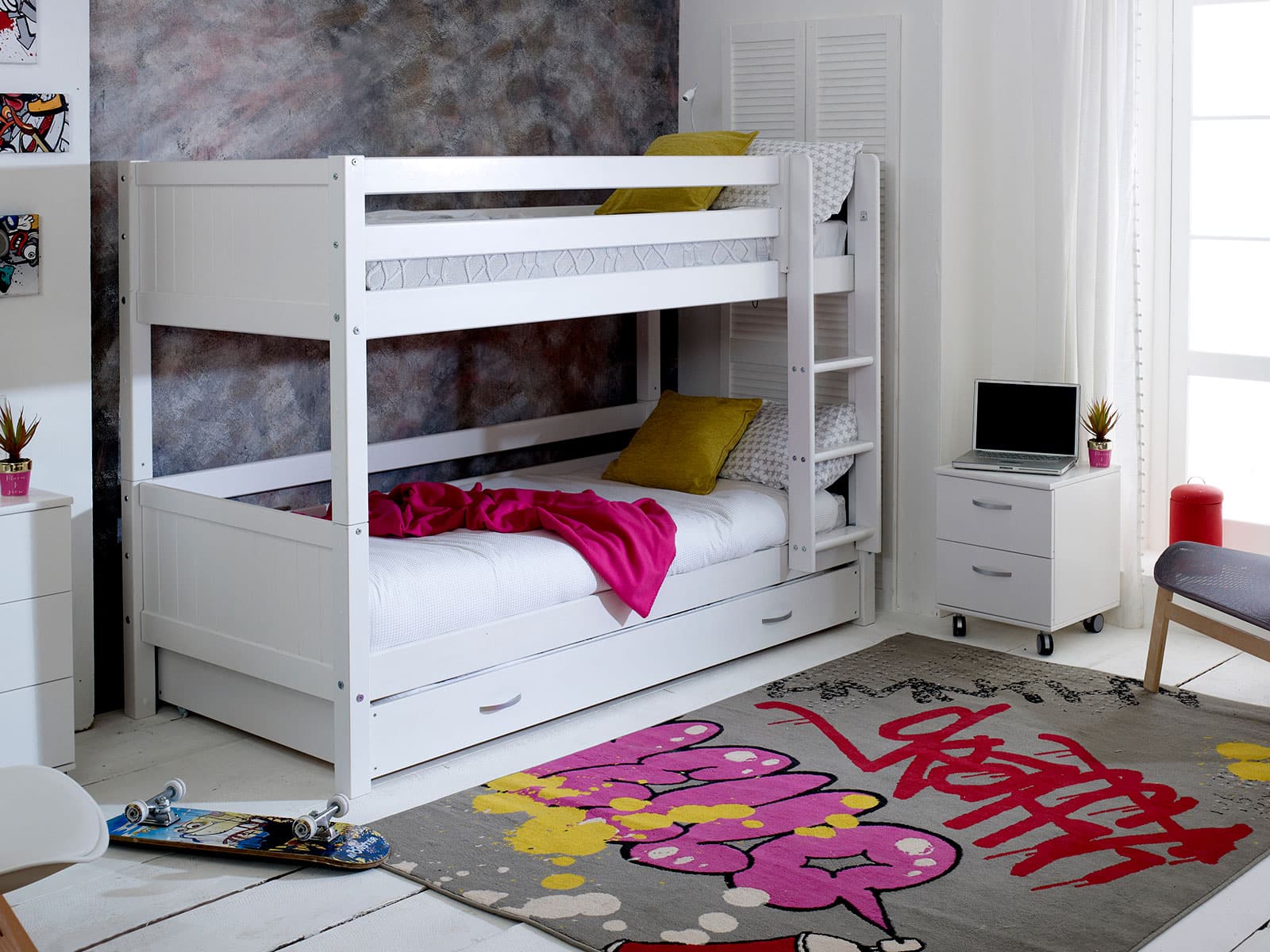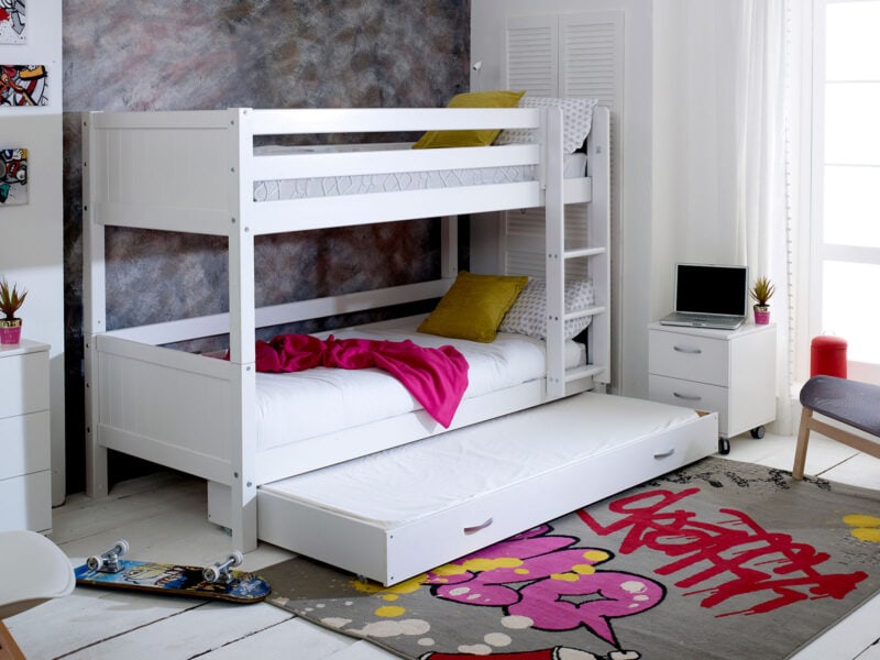 This contemporary and stylish Nordic bunkbed 3 has a sturdy white frame, straight ladder and comes complete with a trundle bed.