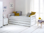 As well as a head and foot board the bed benefits from a back rail creating the stylish day bed look. Under the bed is a pull out trundle bed with 2 storage drawers below that. This white bed is available with a choice of 5 gable ends: flat white, grey, rose, slatted and tongue & groove.