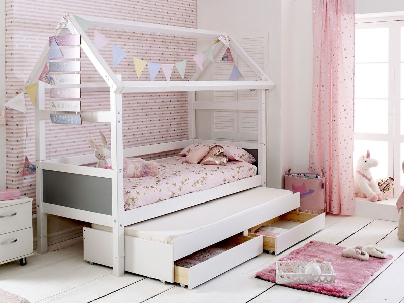 This beautiful Nordic playhouse 2 bed in white features of a pair of underbed drawers and a trundle bed and is 16cm taller than the Nordic Playhouse 1.