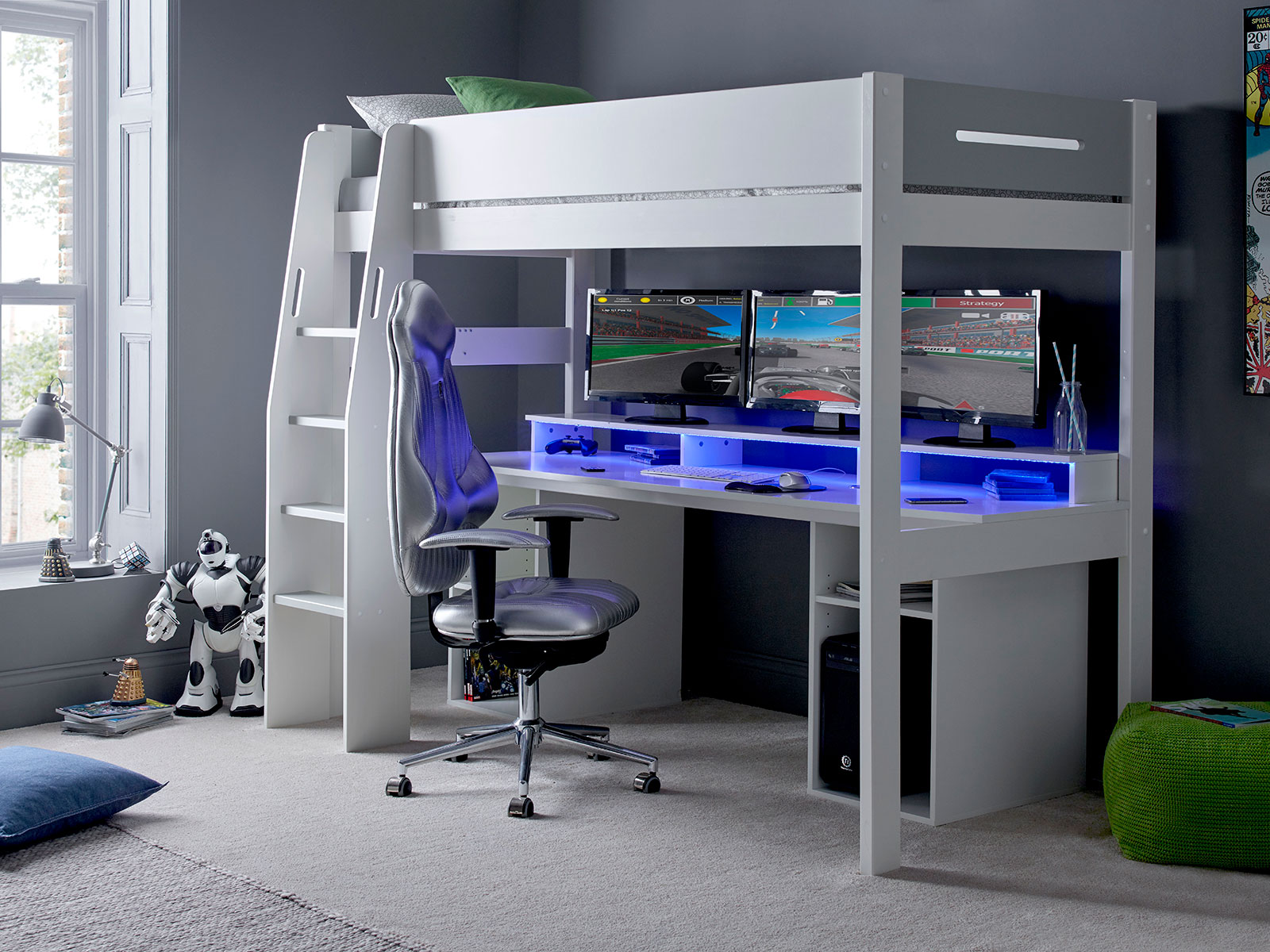 Looking for a complete sleeping, Gaming and storage solution? – look no further. The comfy bed is tucked away up top and access is gained by ladder to the side. An integral desk with shelving under it makes the Urban Grey PC Gaming Highsleeper a must for Gaming, study or work. Not only that but technical features include a wireless charger and remote controlled LED multi colour lighting, you can create the right mood and state of mind for work or play (not provided is a universal UK plug and USB port that is required). The modern Highsleeper is compact for space saving. A large gaming desk under the bed area has an elevated large shelf area to accommodate no less than 3 monitors. Generous space under the shelf means storage is at an optimum, keyboard, mouse, controllers and all essentials can be tucked away to avoid unnecessary clutter on the desk area. Storage units under the desk also provide storage for PC towers.