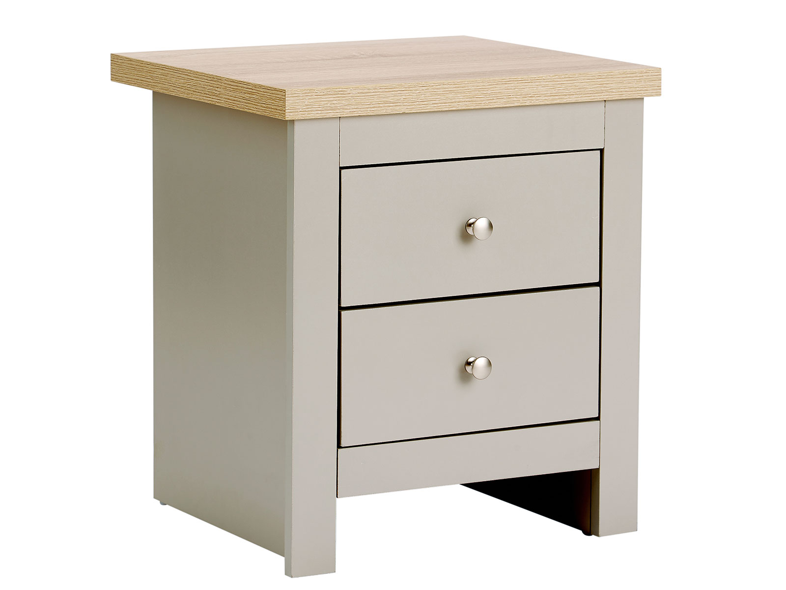 Constructed from particle board and finessed by silver chrome handles on the doors and drawers.
