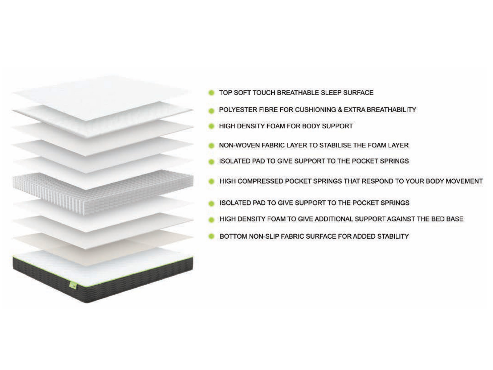 Constructed with 9 comfort layers and a supportive pocket spring system, the Antares mattress provides balanced pressure relief while maintaining a stable sleep surface. With a depth of 21.3cm, it works well with a wide range of bed frames and divan bases.