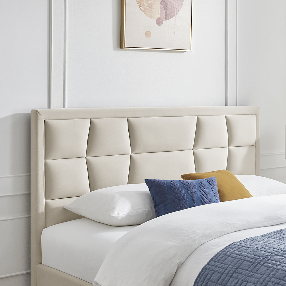 The Limelight Carmen bed frame combines bold geometric design with a refined retro influence, resulting in a striking yet sophisticated statement piece. Upholstered in a luxurious velvet fabric made from 100% recycled low carbon materials, this bed not only elevates your bedroom aesthetic but also supports a more sustainable lifestyle.