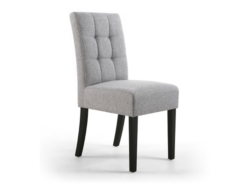 A modern deep seated dining chair with stitched waffle detailing on the back, upholstered in silver grey linen effect fabric. Sprung and belted seat. Available in black rubberwood legs. Assembly required. Sold in boxes of 2.