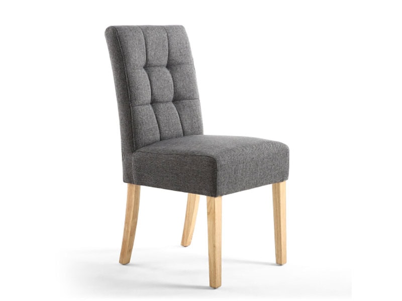 A modern deep seated dining chair with stitched waffle detailing on the back, upholstered in steel grey linen effect fabric. Sprung and belted seat. Available in natural rubberwood legs. Assembly required. Sold in boxes of 2.