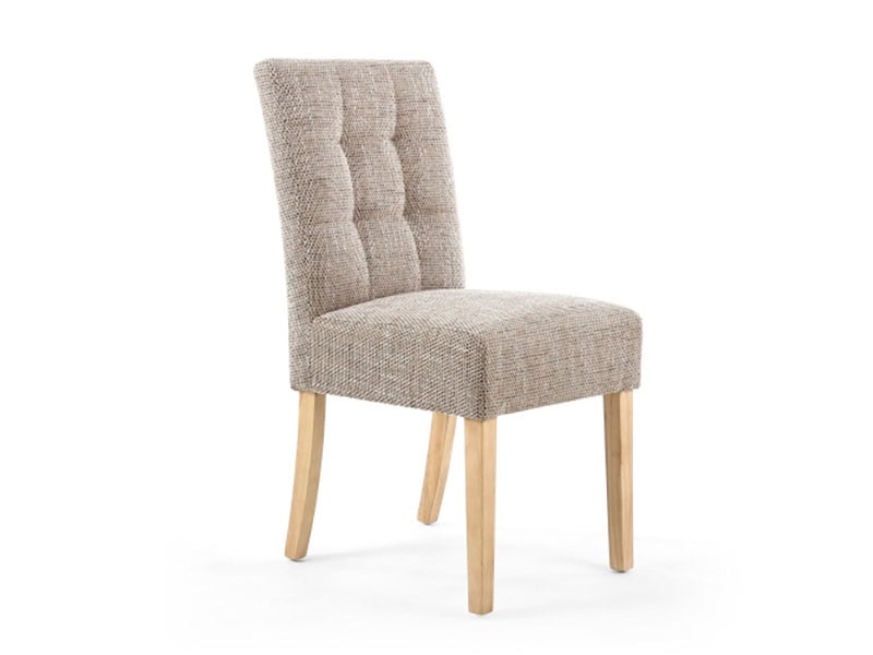 A modern deep seated dining chair with stitched waffle detailing on the back, upholstered in fashionable oatmeal tweed effect. Sprung and belted seat. Available in natural rubberwood legs. Assembly required. Sold in boxes of 2.