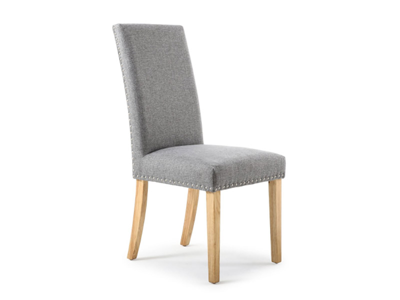 A timeless dining chair enhanced by attractive stud detailing around the edges, upholstered in silver grey linen effect fabric. Sprung and belted seat. Available in natural rubberwood legs. Assembly required. Sold in boxes of 2.