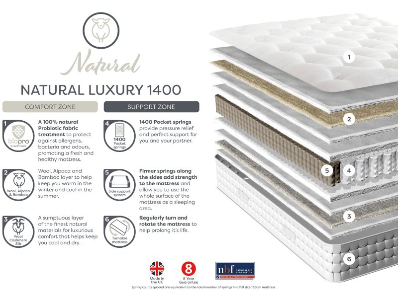 The Relyon Natural 1400 Mattress boasts a few additional fillings with Wool, Silk and Cashmere also hiding beneath the surface of this luxurious mattress, these fillings, combined with Bamboo and Alpaca, make for a satisfying night of slumber. The Natural 1400 even includes an Eco-Comfort layer for maximum overnight moisture management and a Side Support System of springs, to prevent you from quite literally falling out of bed, especially when you’re this comfortable.