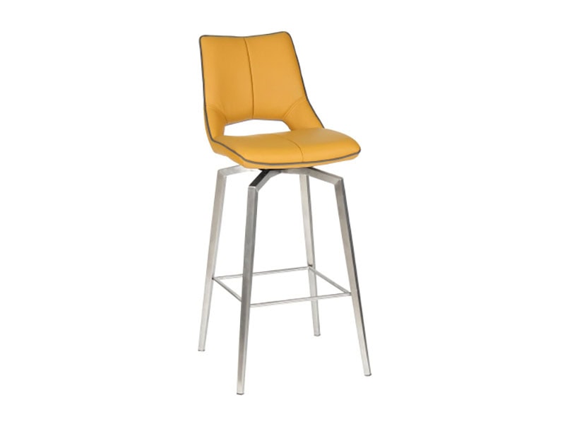 An ultra-modern angled bar chair, upholstered in yellow leather effect with contrasting grey piping. The seat smoothly swivels before gently returning to a central position. Supplied with stainless steel tripod style legs. Assembly required. Sold individually.