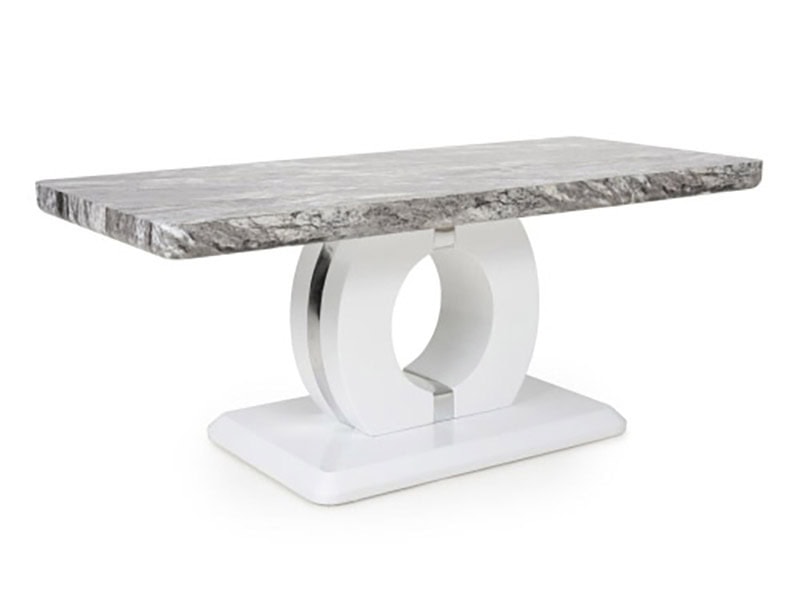 This stunning marble top effect coffee table is a perfect blend of classical and contemporary design. Features a unique white high gloss circular base with chrome trim detailing. Assembly required. Sold individually.