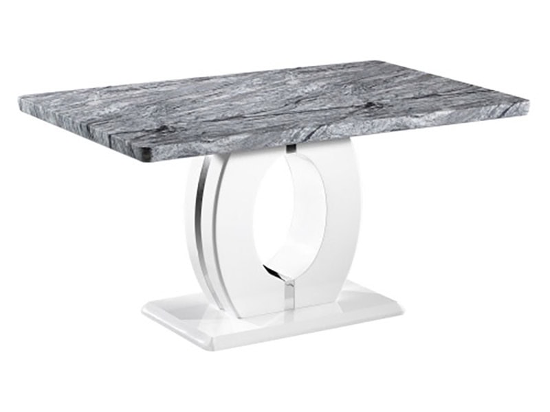 This stunning 1.5m marble top effect table is a perfect blend of classical and contemporary design. Features a unique white high gloss circular base with chrome trim detailing. Large 1.8m table also available. Assembly required. Sold individually.