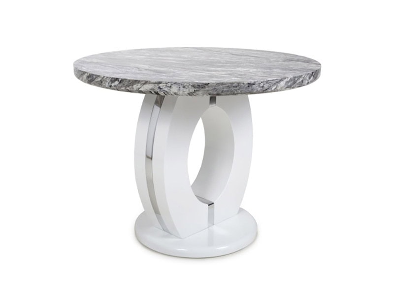 This stunning marble top effect round dining table is a perfect blend of classical and contemporary design. Features a unique white high gloss circular base with chrome trim detailing. Assembly required. Sold individually.