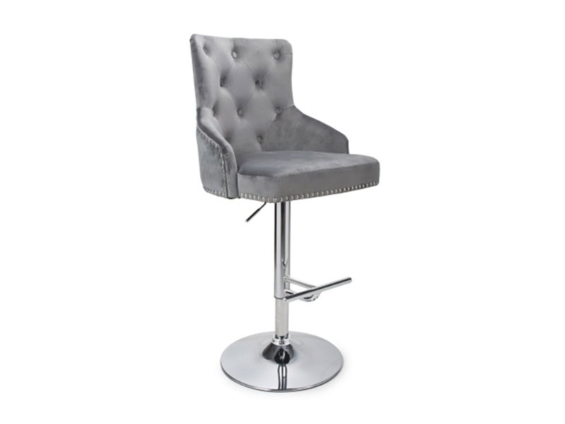 A gorgeous bar stool enhanced by attractive stud detail edging and tufted button back. Upholstered in luxurious grey brushed velvet. Height adjustable up to 127cm. Complete with comfortable chrome footrest and base. Assembly required. Sold individually.