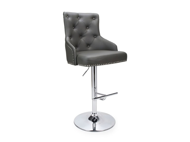 A gorgeous bar stool enhanced by attractive stud detail edging and tufted button back. Upholstered in graphite grey leather effect. Height adjustable up to 127cm. Complete with comfortable chrome footrest and base. Assembly required. Sold individually.