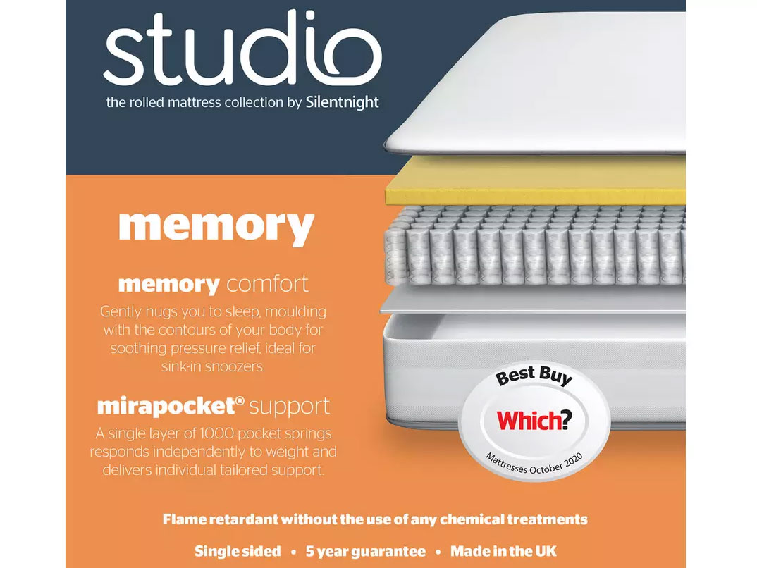 Silentnight Studio Memory 1000 Pocket Mattress is ideal for sink-in snoozers – Ideal for those who love that sink-in feeling at bedtime, the Silentnight Studio Memory mattress is designed to gently hug you to sleep, moulding with the contours of your body. Thanks to its memory layer, it offers soothing pressure relief and ultimate comfort. The mirapocket layer inside uses 1000 pocket springs to individually respond to movement and deliver individual tailored support.