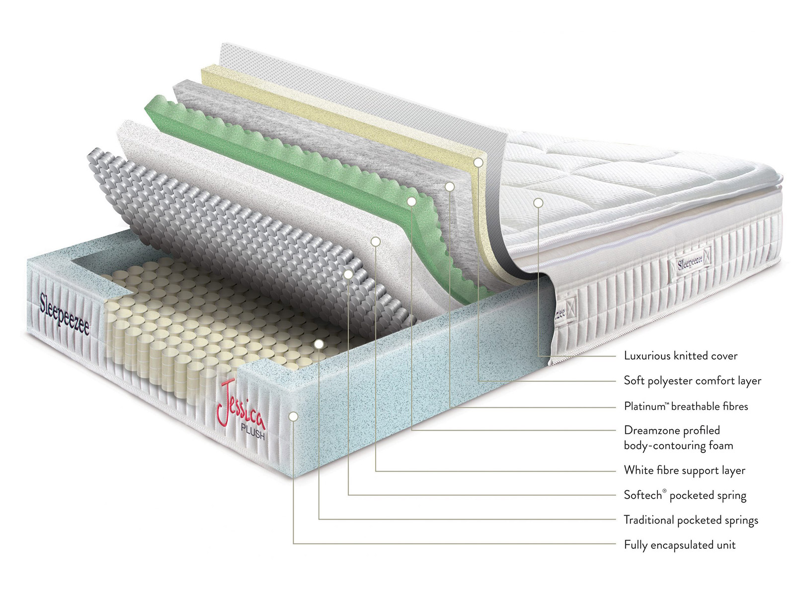 Introducing the Jessica Plush, a medium-soft encapsulated mattress complete with Dreamzone Foam that contours to your body, adjusting to your every movement. And with the perfect blend of technologies, you’re guaranteed to sleep soundly all night long.