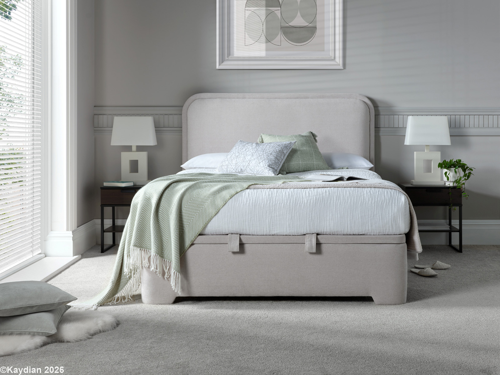 The Kaydian Clithroe Storage Ottoman Bed in Maskat Clay fabric effortlessly combines graceful curves with clever hidden storage, making it a stunning and practical addition to any contemporary or traditional bedroom.