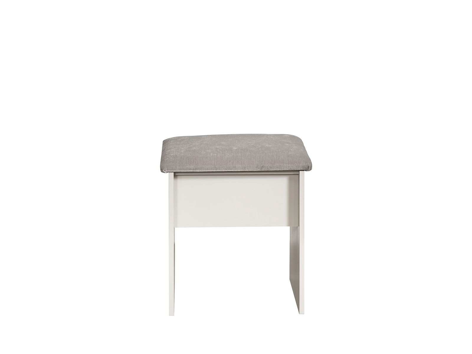 A small vanity stool. A light simple, yet sturdy design, with a soft cushioned seat. Makes an idea companion to a desk or vanity.