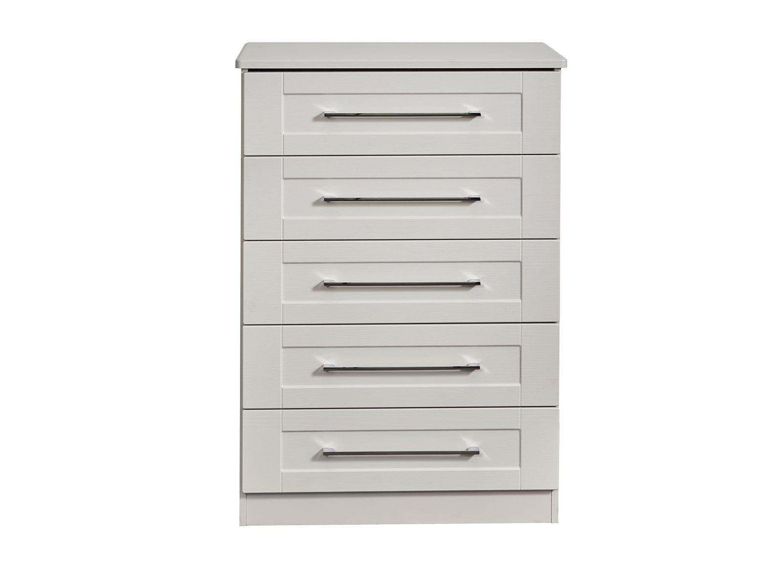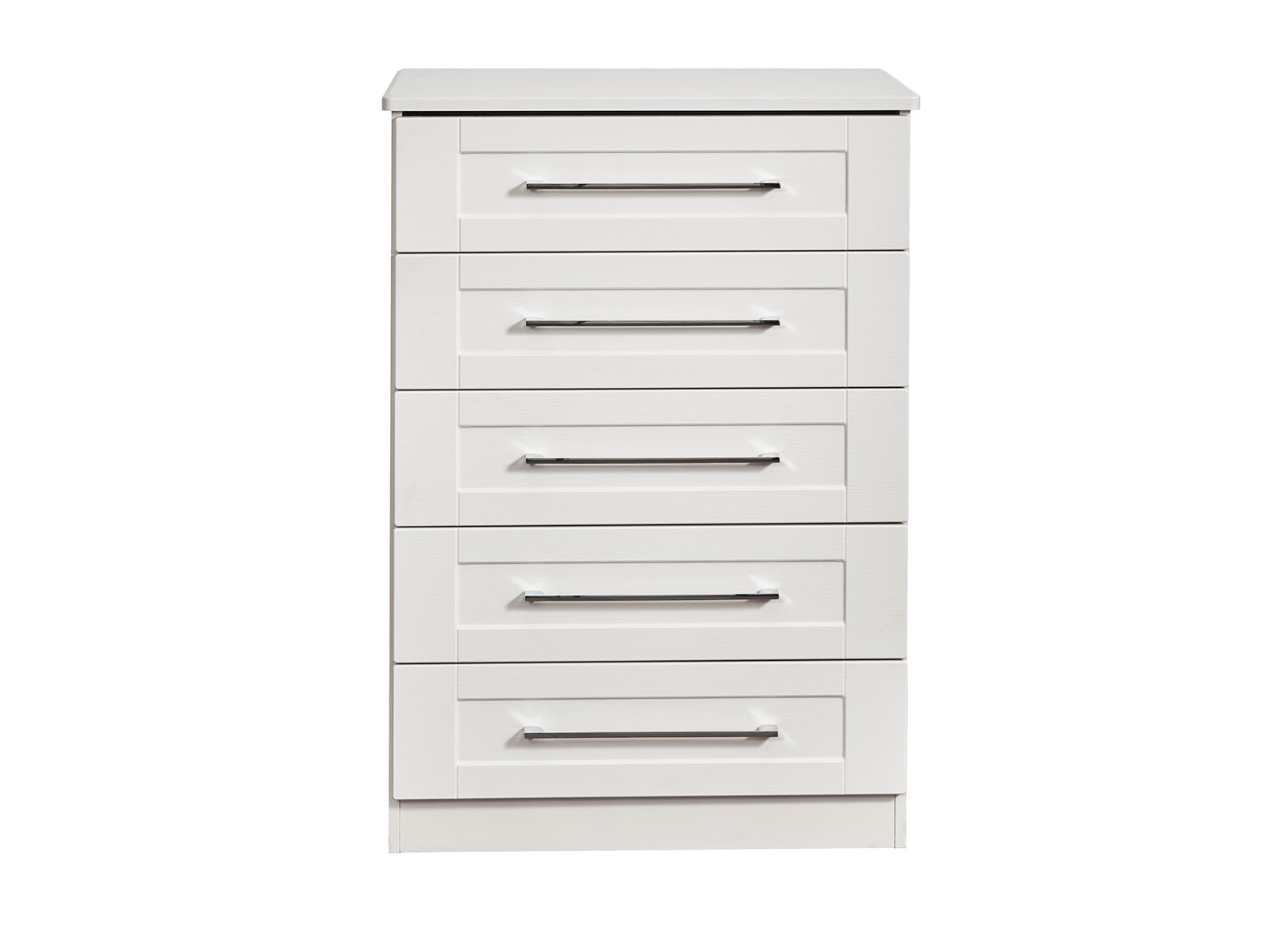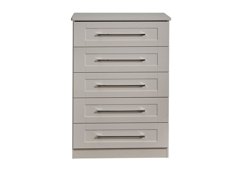 This wide 5 drawer chest of drawers is practical and stylish. Perfect for any home as a free standing storage unit.