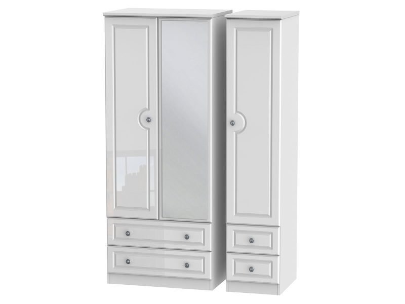 This full height triple 3 door wardrobeis perfect for any bedroom when a normal wardrobe is just not large enough. Also features 2 narrow and 2 wide storage drawers for added practicality as well as a single mirrored door.