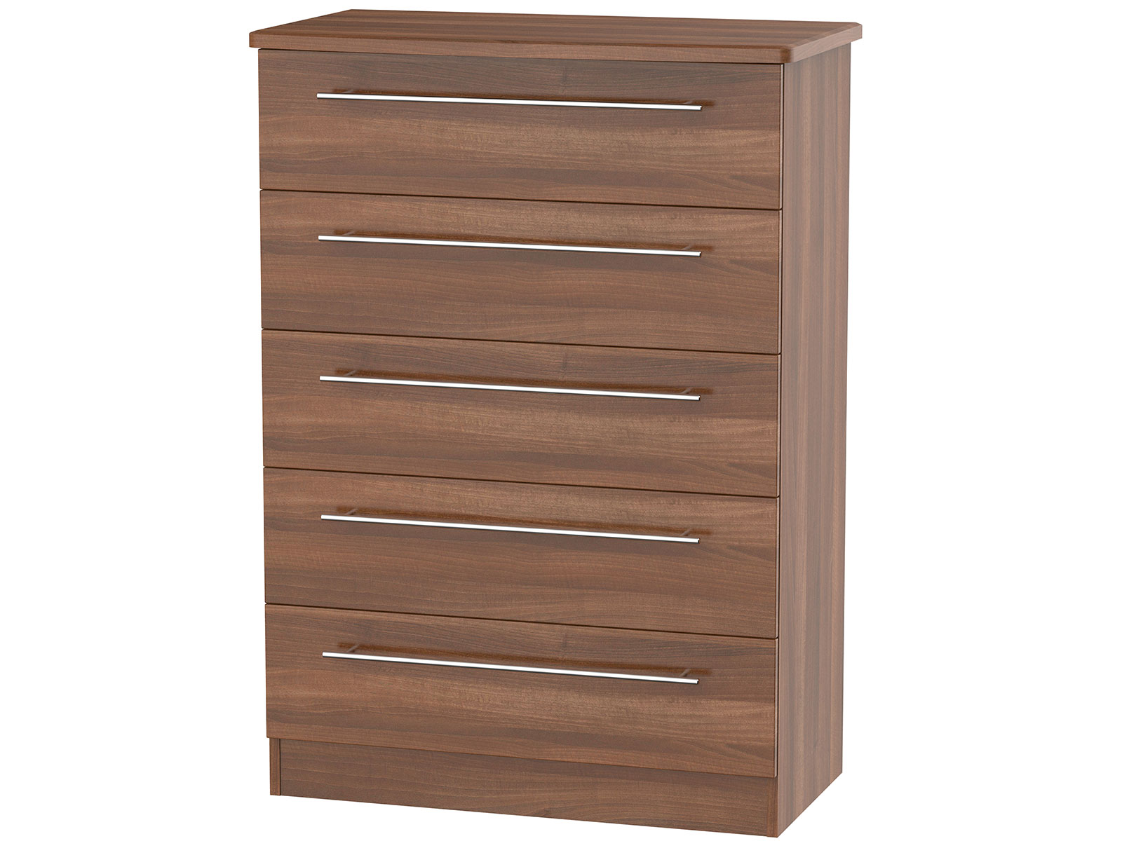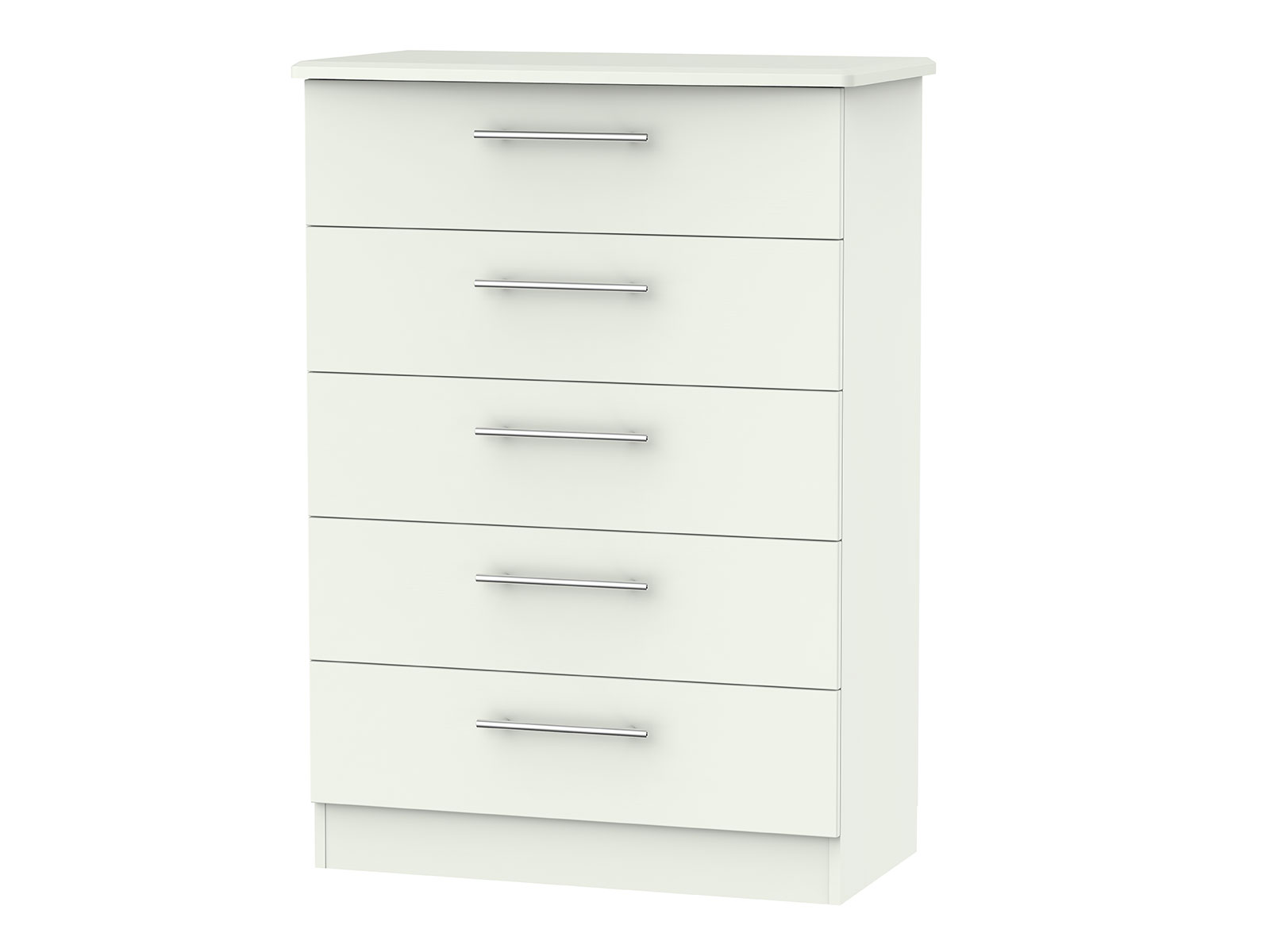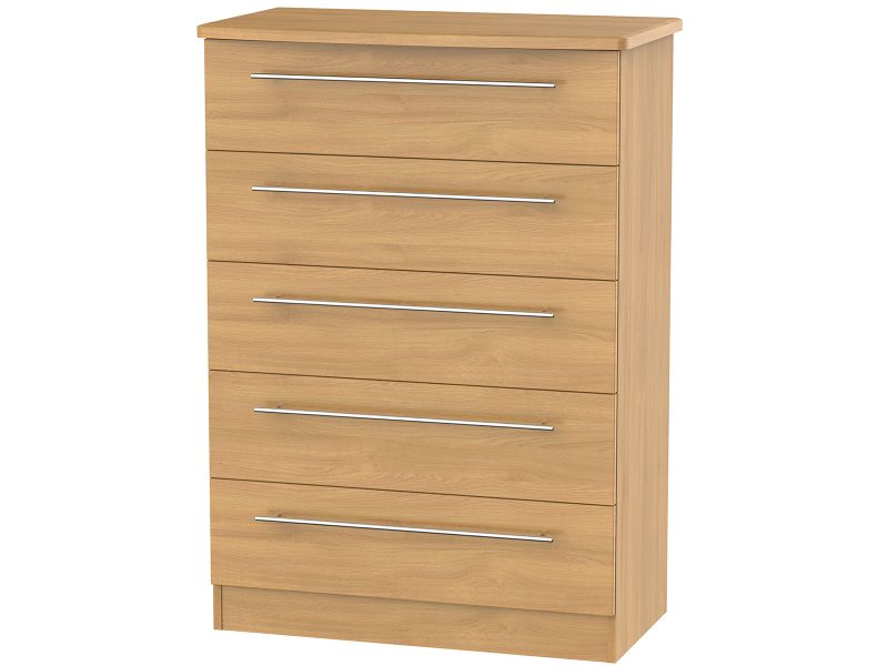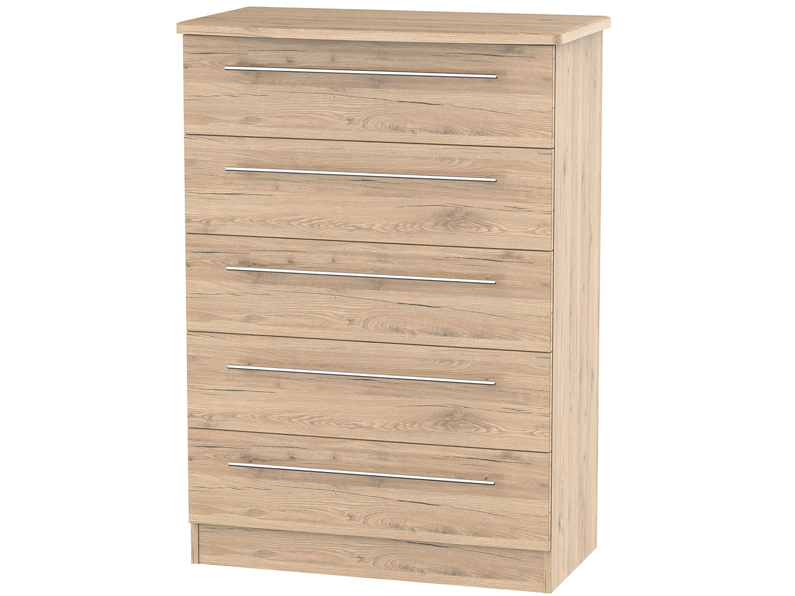 This wide 5 drawer chest of drawers is practical and stylish. Perfect for any home as a free standing storage unit.